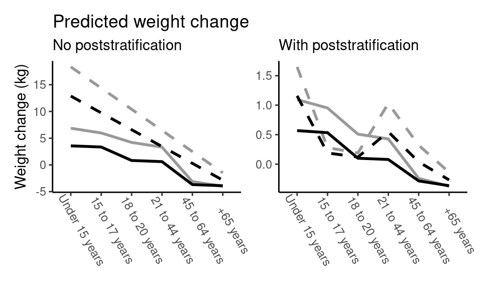 We show two different poststratification implementations. First, a basic frequentist approach – see e.g. also https://github.com/RohanAlexander/mrp_workshop/blob/master/getting-started-with-mrp.Rmd