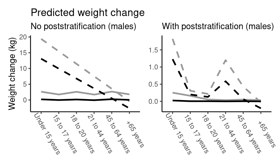 We then apply g-computation with a twist. The twist is that we use the model fitted on nhefs data to get potential outcomes predictions (\(Y^{X=1}\) and \(Y^{X=0}\)) for the census data frame and then weight our predictions with the demographic proportions of each combination of sex and age group in the greater US population according to the census. We finally calculate the difference in means between the weighted predictions to get a marginal effect estimate, which we find to be around 3.5 kg. Before we can do any of it, however, we need to make sure that age_group is treated as numeric and sex as a factor, since this was the variable types used for model fitting.