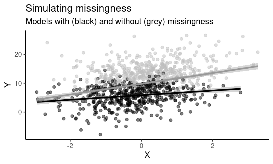 d_miss <- data.frame(X = X, Y = Y, Y_miss = Y_miss)… And then fit two different models: First, a model fitted only on the non-missing observations and then a model on all the data, as if we had access to the full population.